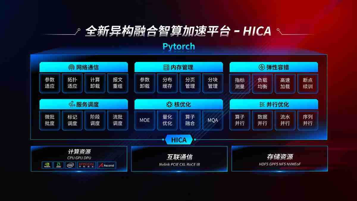 通过自研的服务层、、、中间适配层、、、、以及调度编排算法,,,采用数据并行、、、、模型并行等多种并行方式,,把并行计算任务进行有效的分解,,,,使其分别由相应的软件栈和算力资源来承接。。。当GPU资源变化,,HICA可以实时动态调度计算子任务并调整模型拓扑和架构,,,以充分聚合各种算力资源。。