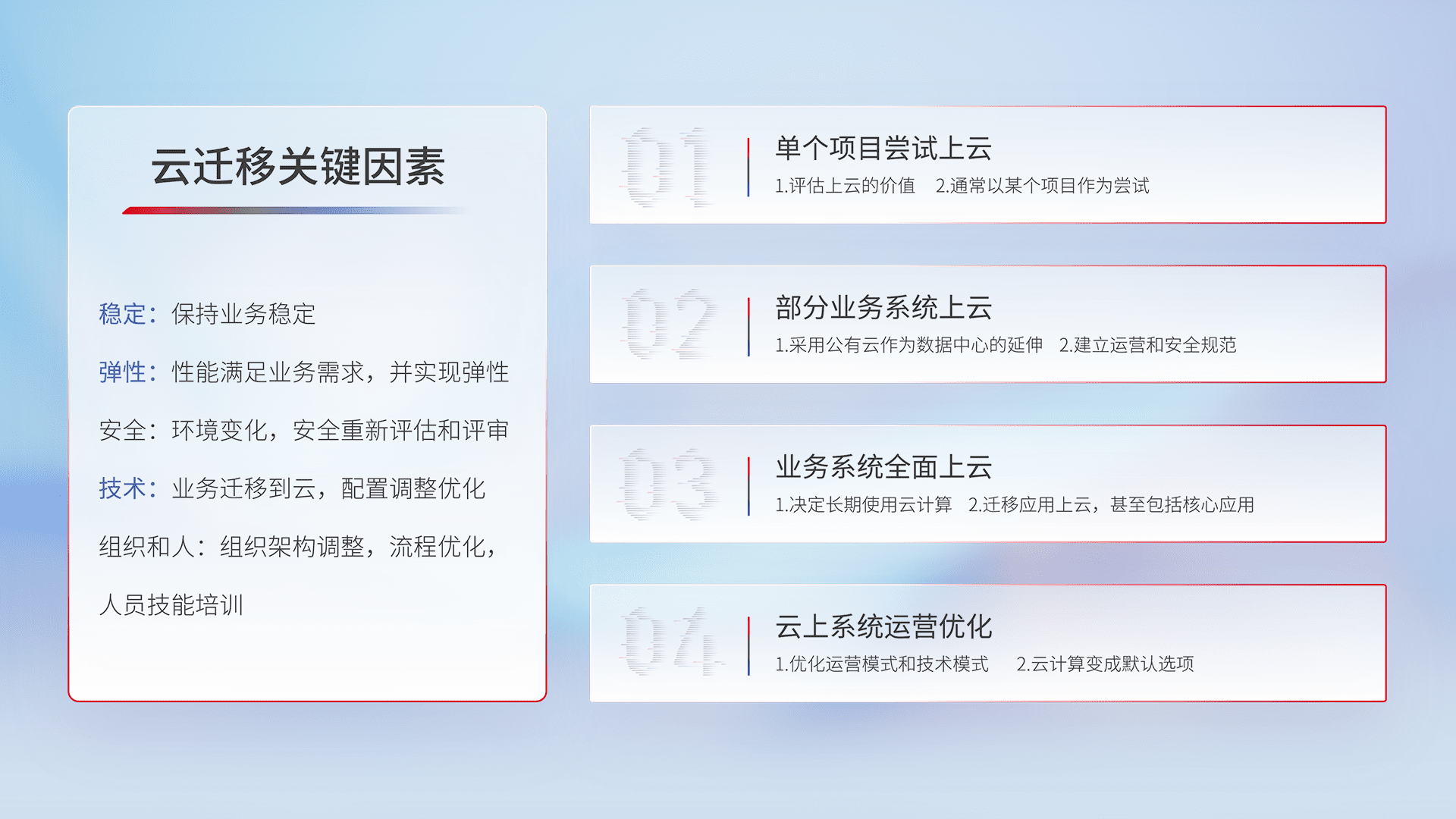 结合实际业务,,,从规划设计、、、、云平台选型、、、、云原生改造、、、、数据迁移、、集成交付,,,迁移全过程为客户识别最佳上云路径,,做好风险识别管理,,,,设计网络架构、、、身份权限、、、、安全审计合规、、操作审计、、、日志审计、、监控告警策略、、多站点容灾设计等,,,对云上基础设施进行整体规划,,提升IT治理水平,,,以满足弹性、、、、高可用、、、、高性能的需求。。
