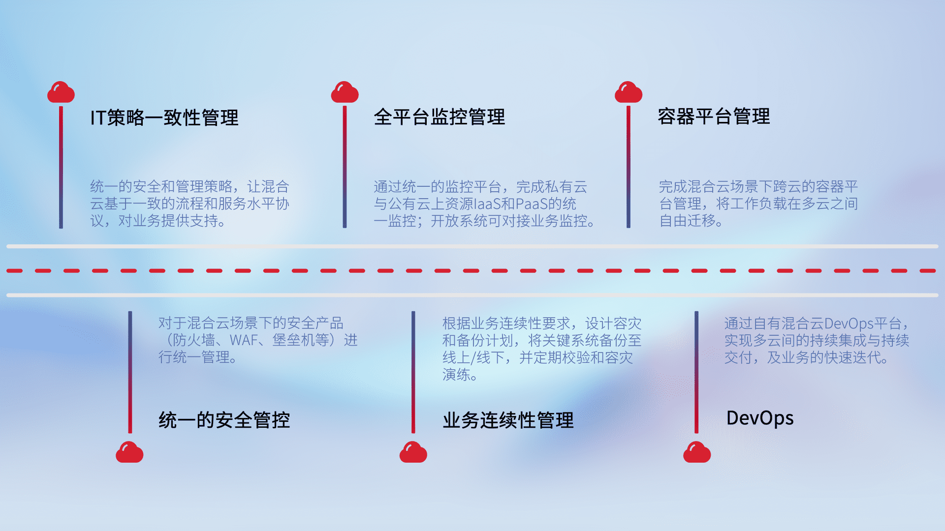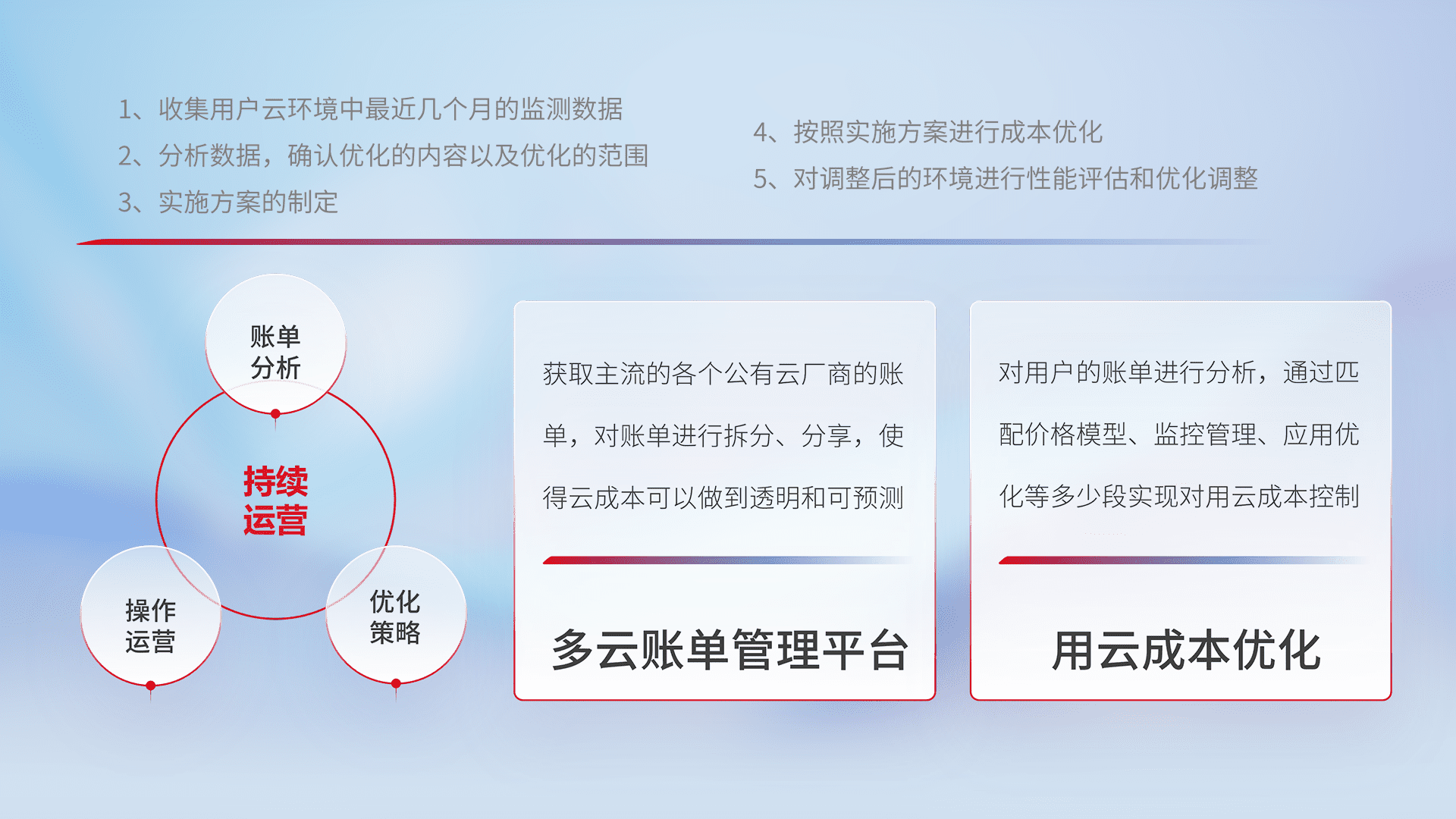 通过多云纳管,,,以统一的资源数据模型把客户的云资源进行抽象和封装,,进而实现对多云资源的统一操作,,保障云资源管理的可靠性、、、稳定性与可用性。。。量身定制化运维内容,,,,配置、、、开发运维、、、、补丁管理、、、、备份、、、监控、、、、认证和访问管理、、审计和日常巡检等,,,,保障在用云过程中的可靠度,,稳定度以及高可用率。。