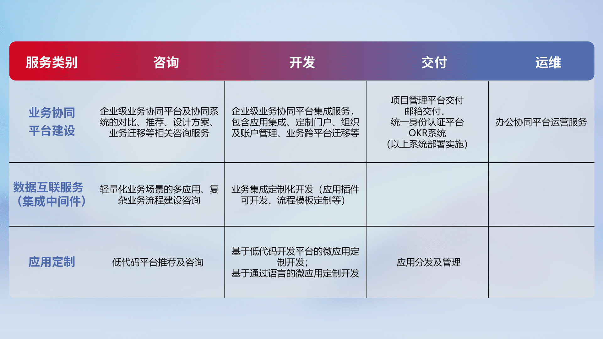 针对钉钉、、、、企微、、、、IDaas等平台级产品提供产品的规划、、、、方案、、交付、、、、定制化开发等服务,,,实现如统一协同办公、、、智能客户服务、、、混合会议管理、、、智能数据查询、、等业务场景,,实现数字化转型。。。。